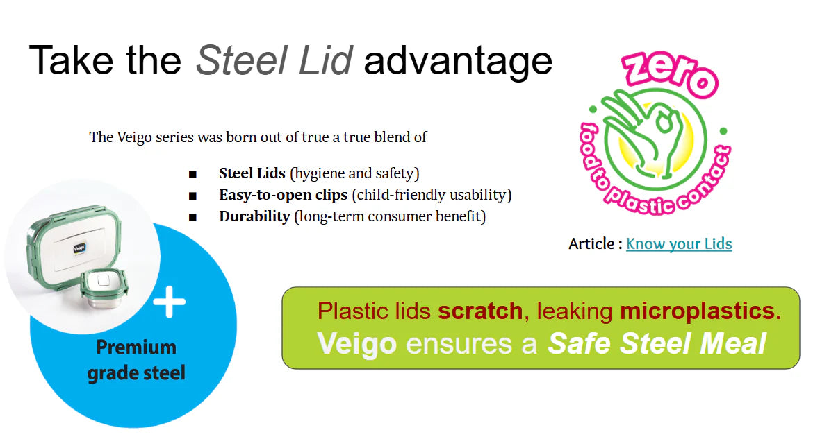 Years of research and thoughtful design led to the creation of Veigo Lunch Boxes—crafted using 100% BIS-certified food-grade stainless steel and virgin, non-toxic polymer parts. Safe, durable, and easy to clean, Veigo is made for everyday use without compromise.